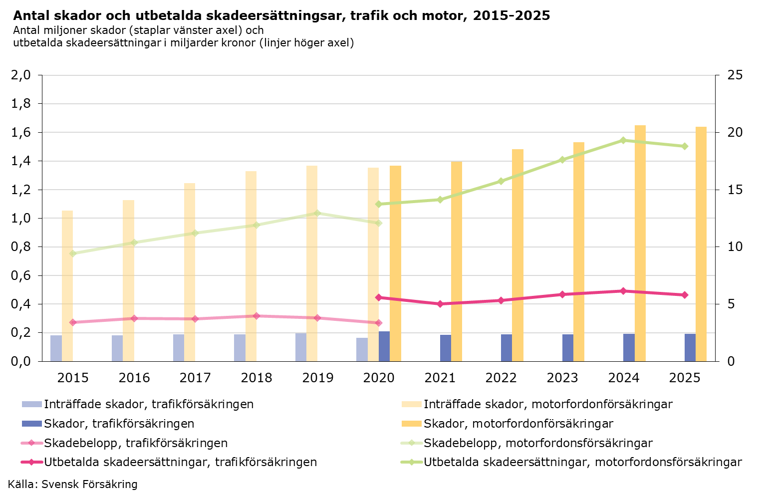 Under 2025 betalade försäkringsföretagen ut närmare 25 miljarder kronor i ersättningar för skador inom trafik- och motorfordonsförsäkringar. Av dessa avsåg nästan 19 miljarder kronor motorfordonsförsäkringar och närmare 6 miljarder kronor trafikförsäkringar.